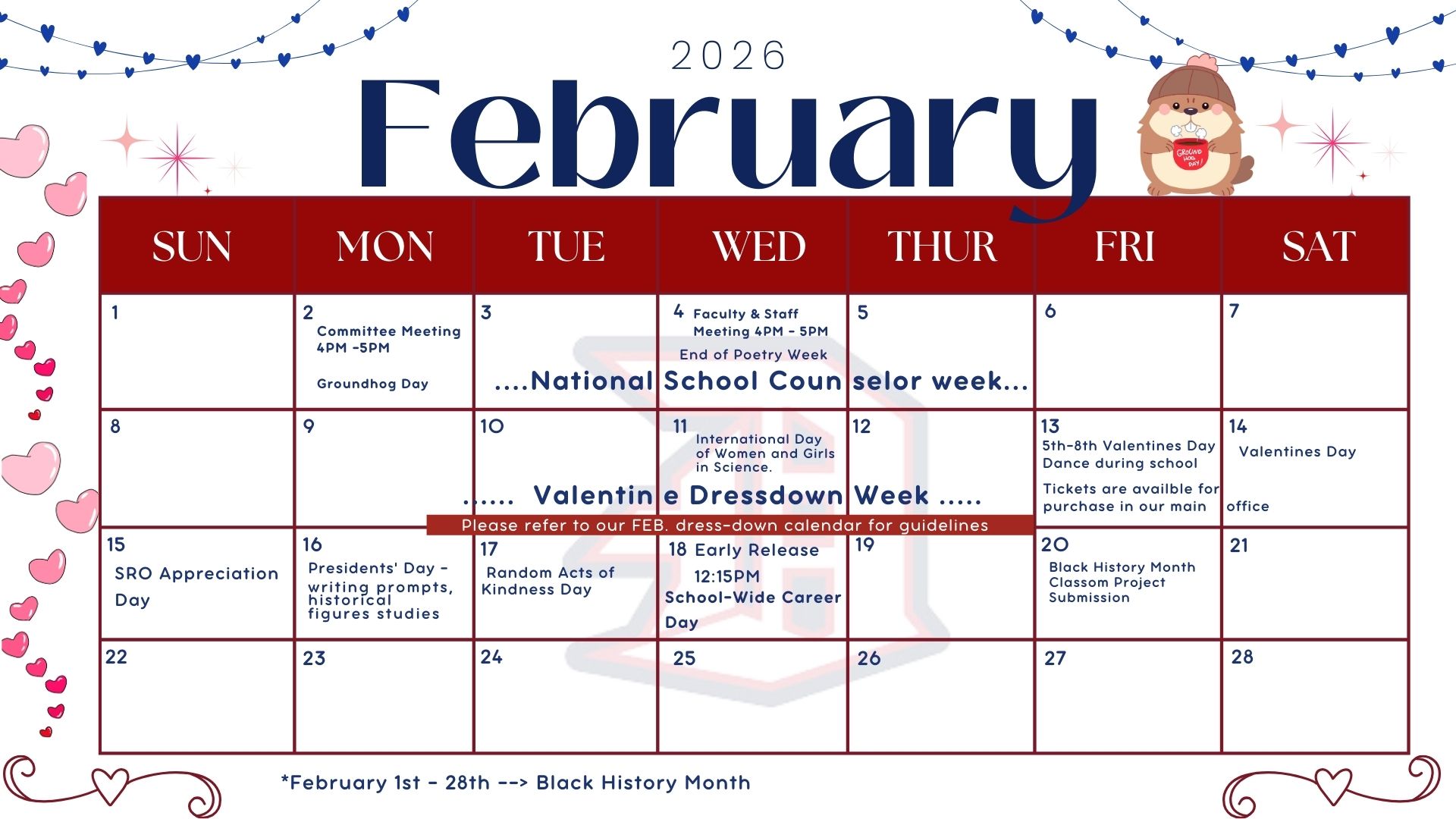 Please review our February calendar for a full list of upcoming events, activities, and important dates. We look forward to another great month of learning and engagement across our campus community.